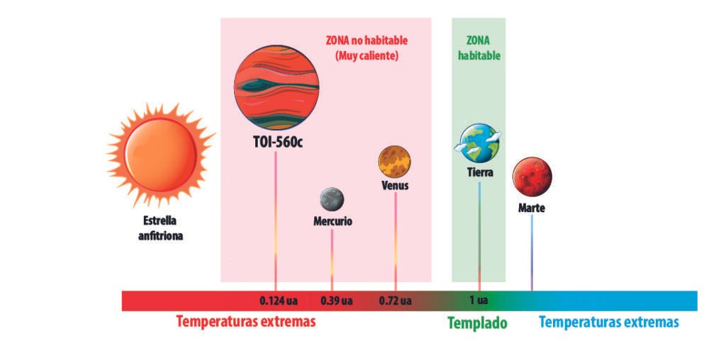 Un factor importante para considerar si un planeta en habitable es su termperatura. Esto se puede estudiar tomando en cuenta la distancia a su estrella anfitriona, en donde el agua permaence en etado liquido en la superficie del planeta, al cual se le llama: zona de habitabilidad. El agua es un componente vital para el desarrollo de la vida como la conocemos. Si el planeta esta muy lejos de su estrella anfitriona el agua parmace en estado solido por congelacion, y si esta muy cerca el agua podria estar en estado gaseoso. En este contexto de aplicación, TOI-560c tiene un período orbital menor que Mercurio, el cual es el planeta más cercano al sol. Como afirma Zhu [1], los planetas entre 1 y 4R⊕ se encuentran con frecuencia en órbitas cercanas alrededor de estrellas similares al Sol. Es poco probable que TOI-560c albergue vida, ya que esta muy cerca a su estrella anfitriona. Lo anterior, trae como resultado altos niveles de radiación debido a esta cercania de su estrella. Debido a esto, la temperatura de TOI-560c es de 498± 15K   la cual es muy alta y tendría consecuencias significativas para el desarrollo de la vida como la conocemos.